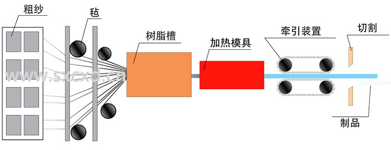 主要成型設(shè)備有紗架、膠槽、模具、牽引機(jī)、型材切割機(jī)等,輔助設(shè)備有烘干機(jī)、攪拌機(jī)、切氈機(jī)等。在成型過程中,每道工序都可以有不同方法:如送紗工序,可以增加連續(xù)纖維氈或三向織物以提高制品強(qiáng)度;牽引工序可以是履帶式牽引機(jī),也可以是液壓式牽引機(jī);固化方式可以是模內(nèi)固化,也可以用加熱爐固化;加熱方式可以是高頻電加熱或是熔融金屬等。
