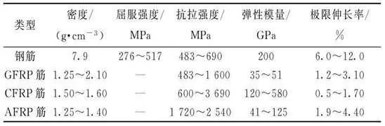 在處于惡劣環(huán)境條件時,如干濕交替、化學(xué)介質(zhì)等作用下,普通鋼筋極易發(fā)生腐蝕,嚴(yán)重影響結(jié)構(gòu)的耐久性和適用性,導(dǎo)致結(jié)構(gòu)承載能力的降低。在這種情況下,防腐性能好、黏結(jié)性能與鋼筋相差不多且抗拉強度高的FRP筋成為代替鋼筋的一個較好選擇(表1)。