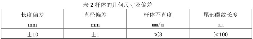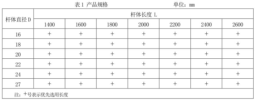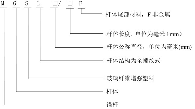 示例:公稱直徑為20mm,長度為1800mm,桿體尾部結(jié)構為非金屬材料的全螺紋式樹脂錨桿玻璃纖維增強塑料桿體,可標記為MGSL20/1800F。