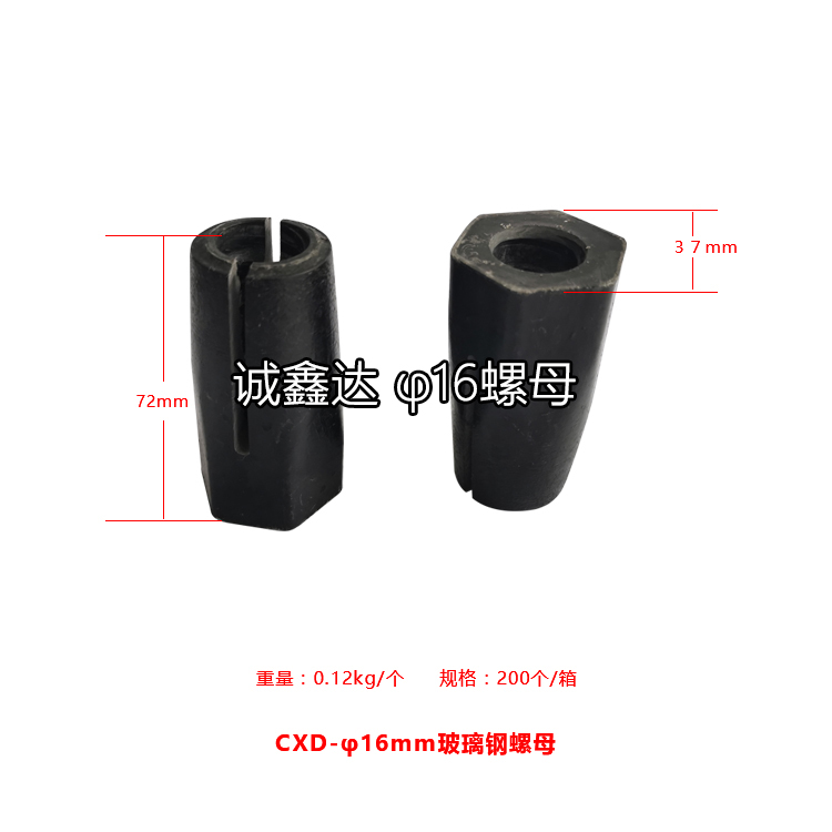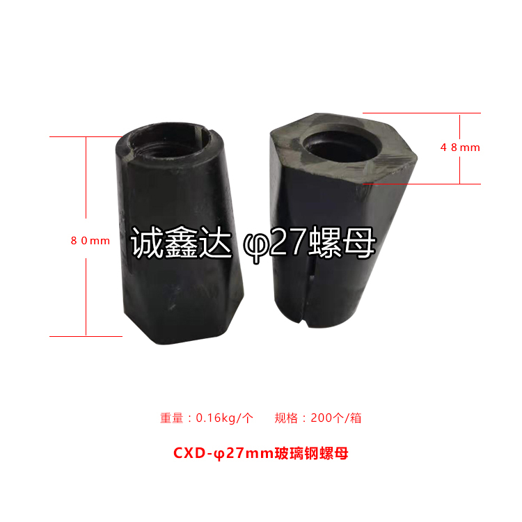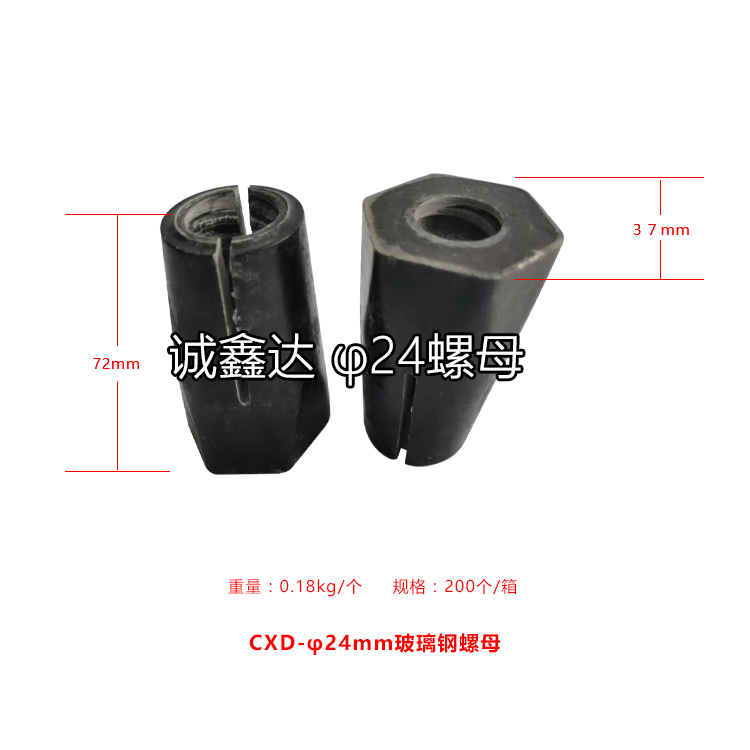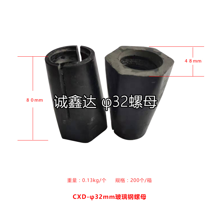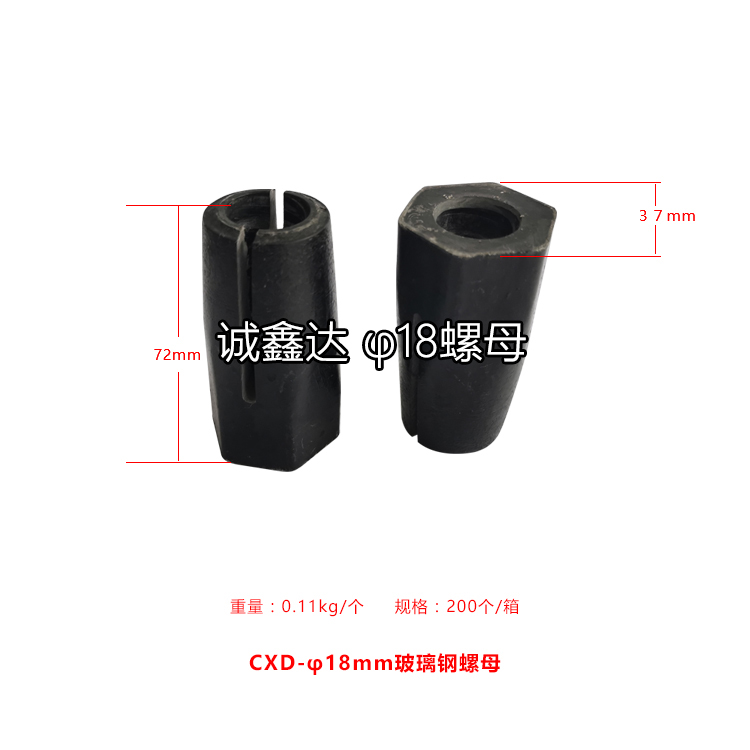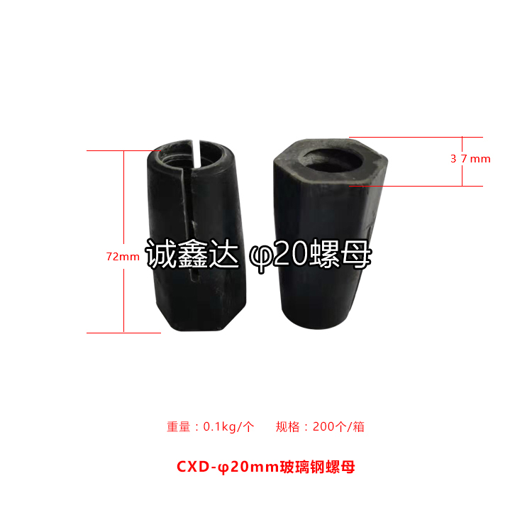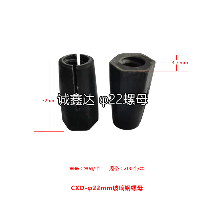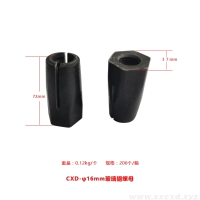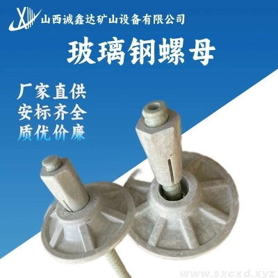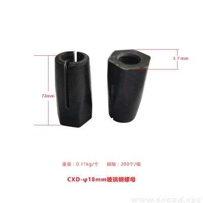 作為礦山支護配件,山西誠鑫達研發(fā)了一種高抗拉強度的玻璃鋼螺母,螺母本體開有內(nèi)螺紋孔,在內(nèi)螺紋孔孔壁設螺紋,螺母本體的前部分外形為錐形且用于與托盤緊密配合,在螺母本體的前部分的錐形面開設有通槽,螺紋孔的前部呈喇叭形,這樣螺紋孔的前端直徑大于后端的直徑,進入托盤錐形孔后,螺母本體的前端和中部同時收縮,使螺母本體的內(nèi)螺紋與錨桿外螺紋緊密配合,拉緊長度增加到25mm—30mm,擴散了應力,使抗拉強度明顯提高。