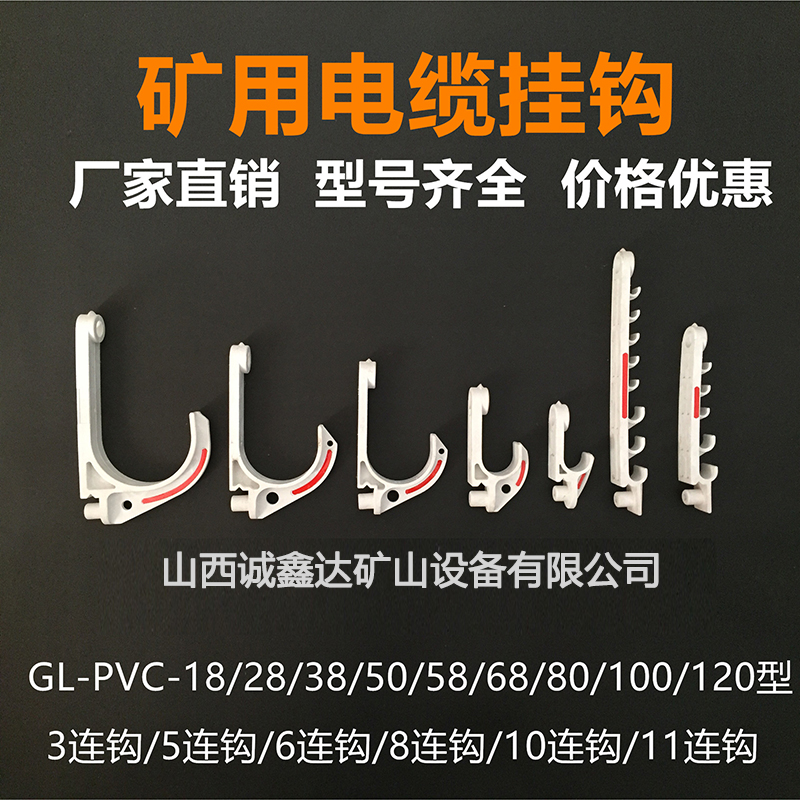 礦用電纜掛鉤主要包括:18型、28型、38型、50型、58型、68型、80型、100型、120型、3連鉤、5連鉤、6連鉤、8連鉤、10連鉤、11連鉤、管道掛鉤、水袋掛鉤、鋼絲扣、固定扣、GL-PVC18、GL-PVC28、GL-PVC38、GL-PVC50、GL-PVC58、GL-PVC68、GL-PVC80、GL-PVC100、GL-PVC120、18三連鉤、70三連鉤、五連鉤、小六連鉤、18六連鉤、八連鉤等;還可以根據(jù)客戶的需要進(jìn)行定制,山西誠(chéng)鑫達(dá)公司有煤安認(rèn)證,質(zhì)量均符合國(guó)家標(biāo)準(zhǔn)。