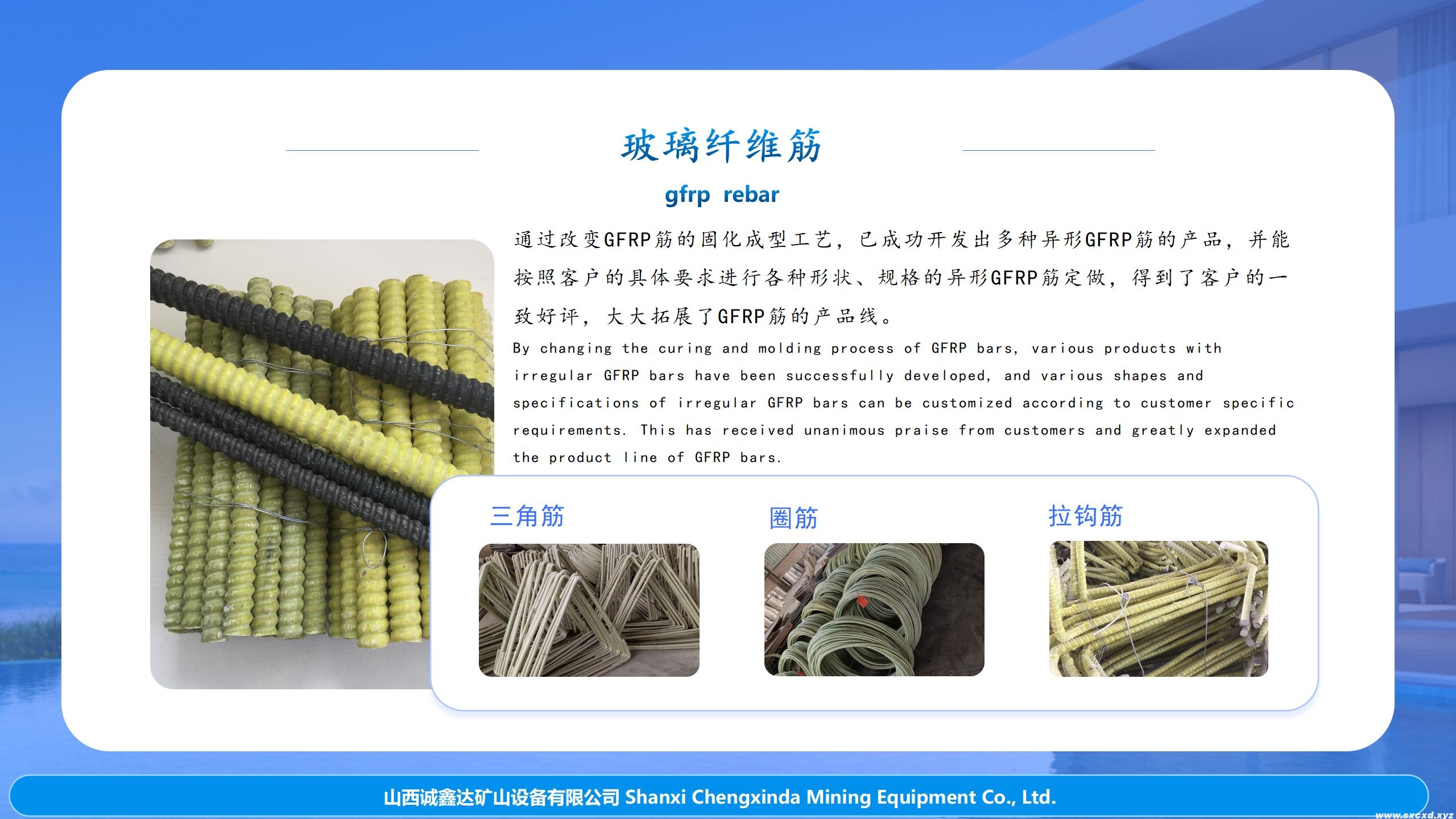 玻璃鋼全螺紋錨桿生產(chǎn)線生產(chǎn)的玻璃鋼錨桿桿體性能不僅滿足(中華人民共和國(guó)煤炭行業(yè)標(biāo)準(zhǔn)MT/T1061-2008)要求,而且還能滿足發(fā)達(dá)國(guó)家先進(jìn)技術(shù)標(biāo)準(zhǔn)的要求(BS7861-2007),該生產(chǎn)線生產(chǎn)效率高,能耗低,用工少,適用性強(qiáng),不僅適用玻璃鋼(GRP)全螺紋錨桿,的生產(chǎn),還適用于生產(chǎn)土工工程用玻璃纖維(GFRP)增強(qiáng)筋材的生產(chǎn)!