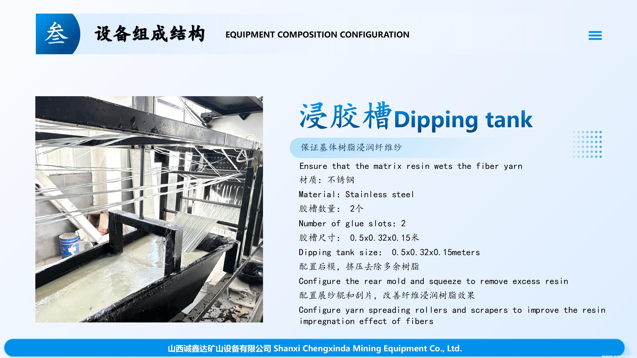 放在紗架上的玻璃纖維紗由于尾部牽引系統(tǒng)的作用,通過(guò)過(guò)絲板,送到了浸料槽,進(jìn)料槽內(nèi)有樹(shù)脂,玻璃纖維紗在進(jìn)料槽內(nèi)浸滿了樹(shù)脂,然后在通過(guò)預(yù)成型系統(tǒng)合攏成束,在模具內(nèi)經(jīng)過(guò)加熱器加熱熔融,通過(guò)液壓系統(tǒng)擠壓成型,在通過(guò)纏繞系統(tǒng),成為全螺紋玻璃纖維塑料杠體,(在進(jìn)料槽、預(yù)成型系統(tǒng)、纏繞系統(tǒng)前端有硅膠片,作用是保證桿體光滑,無(wú)氣泡)然后進(jìn)入烘干系統(tǒng)進(jìn)行固化,經(jīng)過(guò)切割組件將桿體切割成所需要的長(zhǎng)度,經(jīng)過(guò)品管員的檢驗(yàn),入庫(kù)。